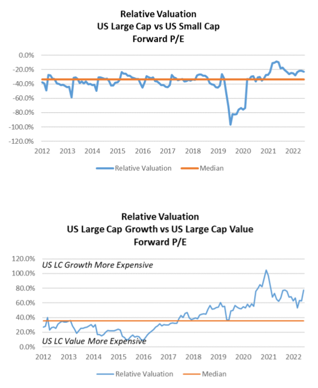 - U.S. Large Cap growth equities are meaningfully more expensive than U.S. Large Cap value equities based on relative fundamental valuation metrics.